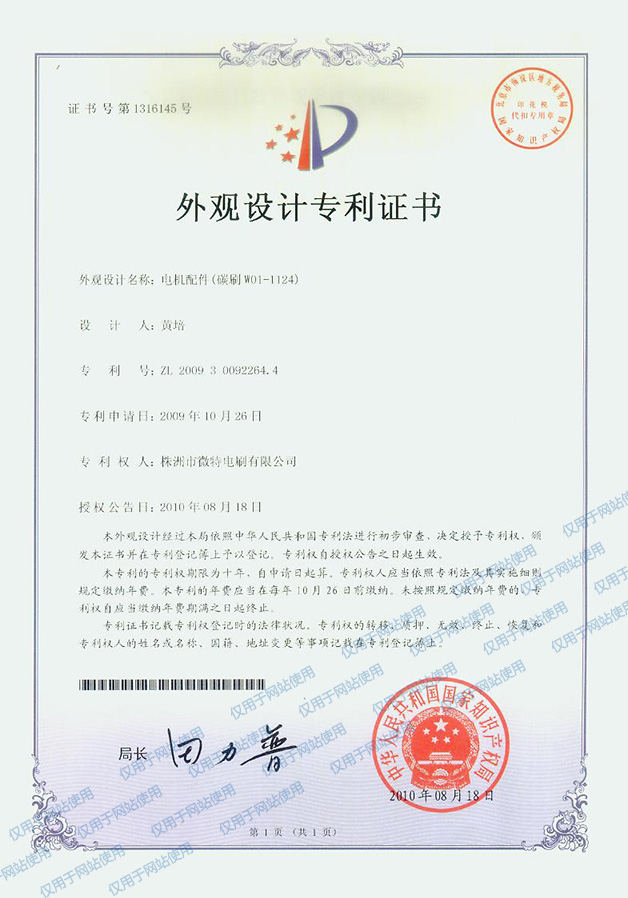 機(jī)電配件(碳刷W01-1124)--2010年外觀設(shè)計(jì)專利證書006
