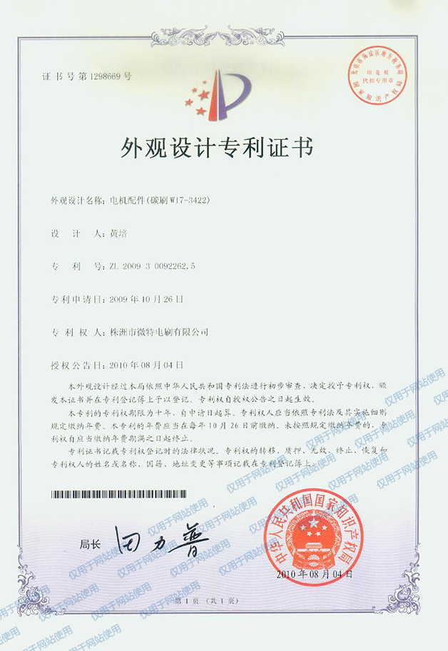 機電配件(碳刷W17-3422)--2010年外觀設計專利證書001