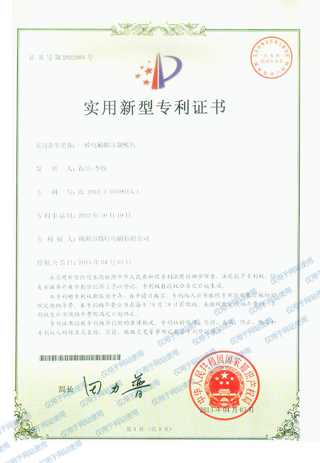 Patent Certificate of a pressing mould of carbon brush